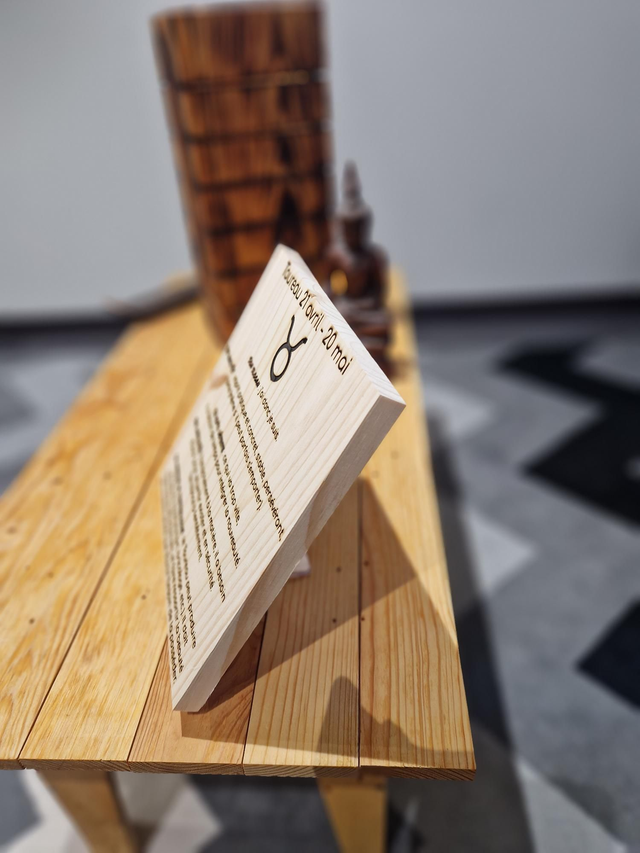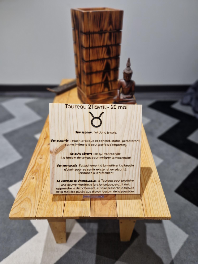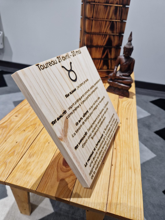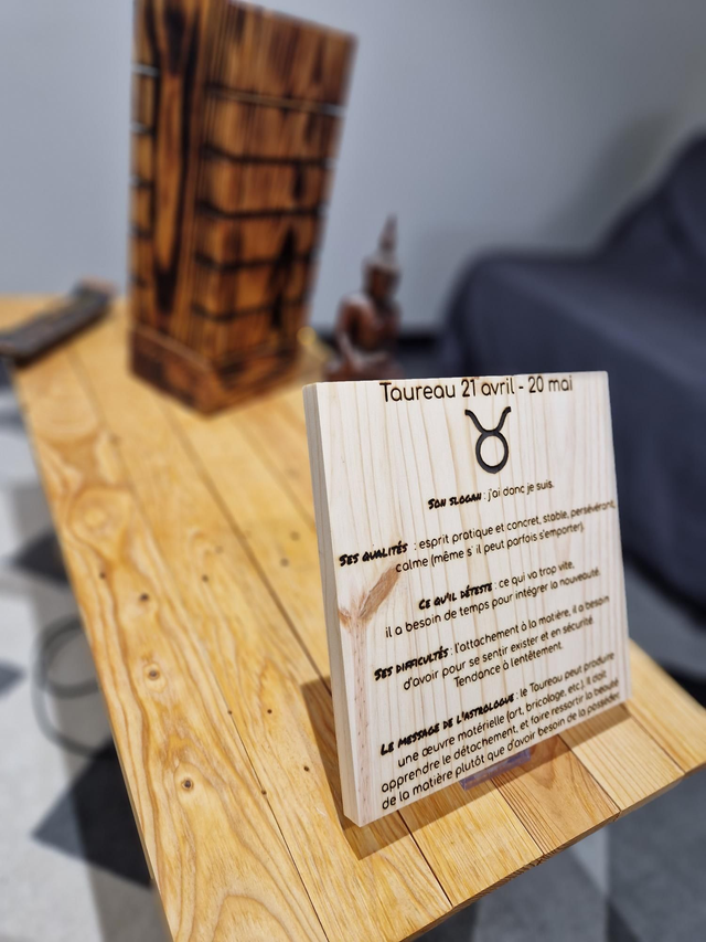 Le bois est gravé au laser (brûlé et légèrement creusé).